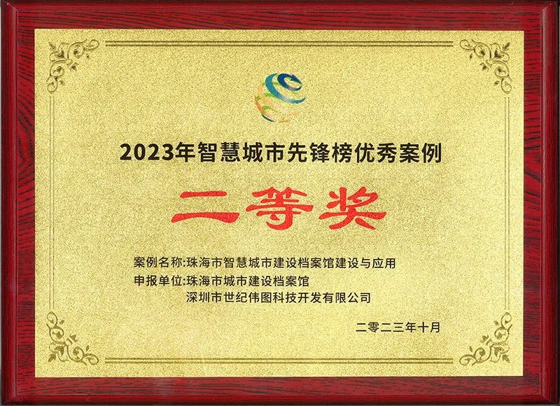 作为中国智慧城市大会的主题活动之一,2023年智慧城市先锋榜榜单在开幕式同期发布。深圳世纪伟图助力智慧城市建设,“珠海市智慧城市建设档案馆建设与应用”项目荣获“2023智慧城市先锋榜优秀案例二等奖”。