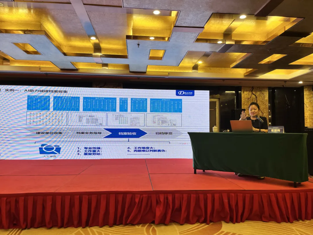 深圳市世纪伟图科技开发有限公司总经理崔丽梅受邀参加本次会议,并做了《AI助力建设城建档案新时代》的主题分享。