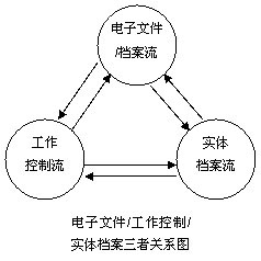 城建档案馆子系统结构图中,含三个概念:电子文件/档案流(左)、工作控制流(中)、实体档案流(右)。三者关系如下: